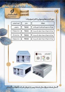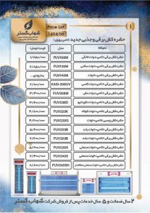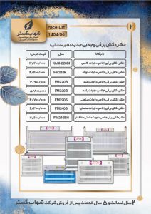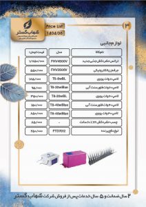 لیست قیمت محصولات کالای برق فروغی لیست قیمت محصولات مخصوص همکاران و خرید عمده در این صفحه لیست قیمت تمامی محصولات موجود در کالای برق فروغی قرار داده شده تا شما عزیزان بتوانید براحتی قیمت تمامی محصولات الکتریکی را مشاهده کنید.برای دریافت درصد تخفیف خود لطفا با شماره های دفتر تماس بگیرید تا طبق تعداد و نحوه پرداخت درصد تخفیف فاکتور خود را متوجه شوید.در بالای هر لیست قیمت تاریخ بروزرسانی و آپلود کردن فایل قرار داده شده. لیست حشره کش ها و لوازم برقی موجودتاریخ بروزرسانی :آذر 1404 1404/09/15برای دانلود هر لیست بصورت PDF یا عکس روی دکمه آن کلیک کنید دانلود لیست شماره 1 محصولات شرکت شهاب گستر دانلود لیست شماره 2 محصولات شرکت شهاب گستر دانلود لیست شماره 3 محصولات شرکت شهاب گستر دانلود لیست شماره 4 محصولات شرکت شهاب گستر دانلود لیست شماره 5 محصولات شرکت شهاب گستر