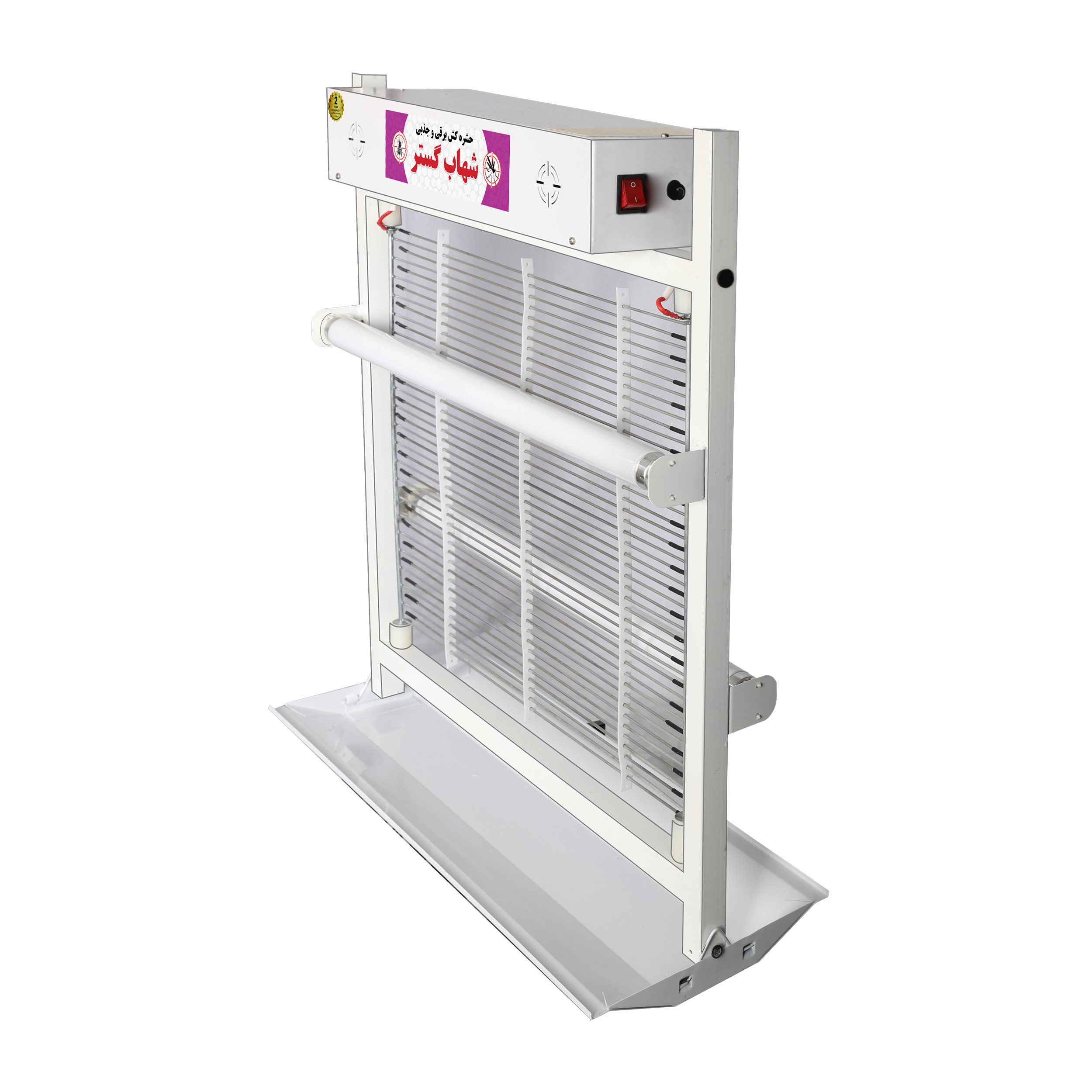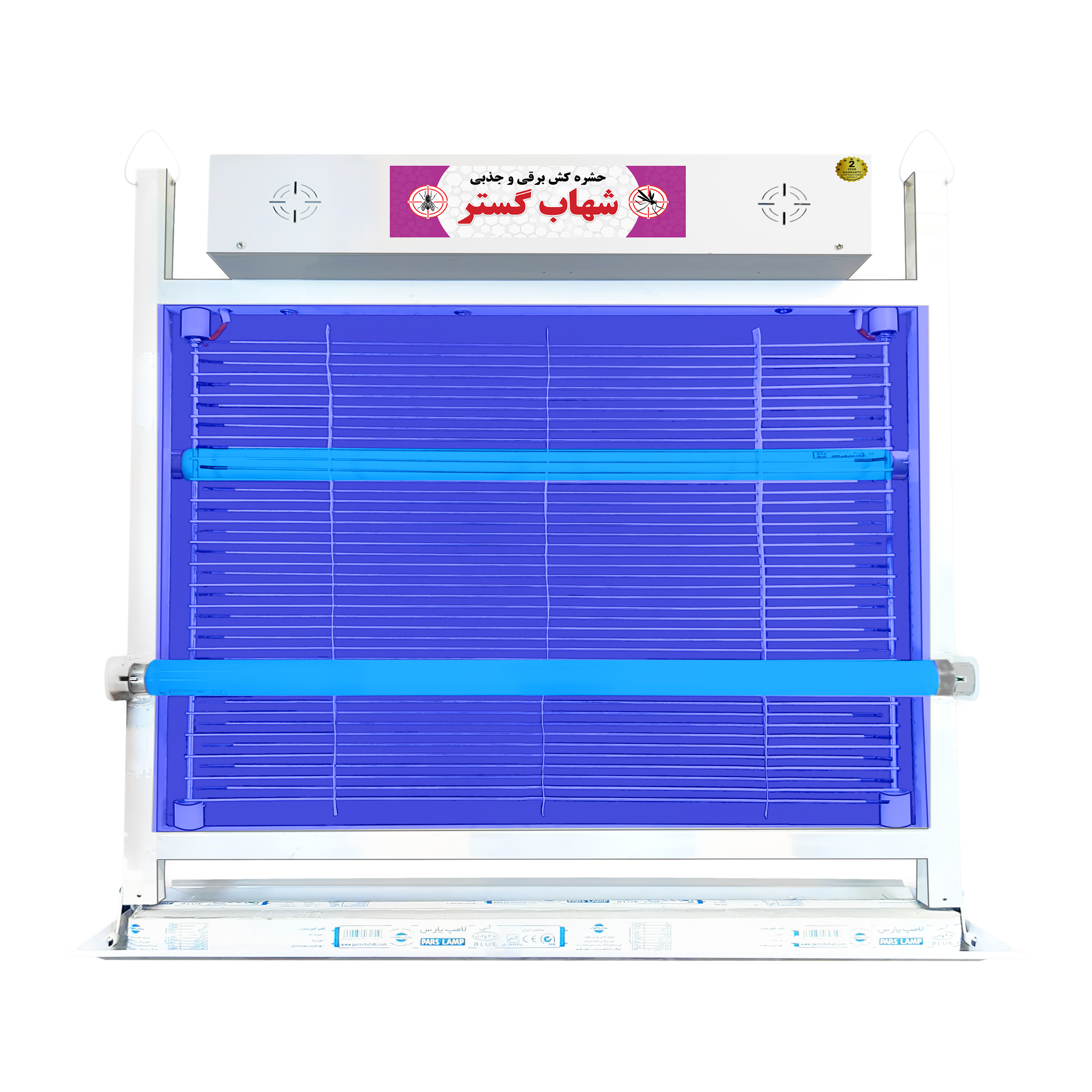 حشره کشی پر قدرت گروه محصولات صنعتی شهاب گستر . دارای دو عدد لامپ 20 وات فلورسنت آبی جهت جذب حشرات بالدار.دارای مفتولهایی منظم با عایق بندی مناسب و اتصال دایمی به برق خروجی(hv های ولتاژ) ترانس جذبی برای نابودی مستمر حشرات به دام افتاده