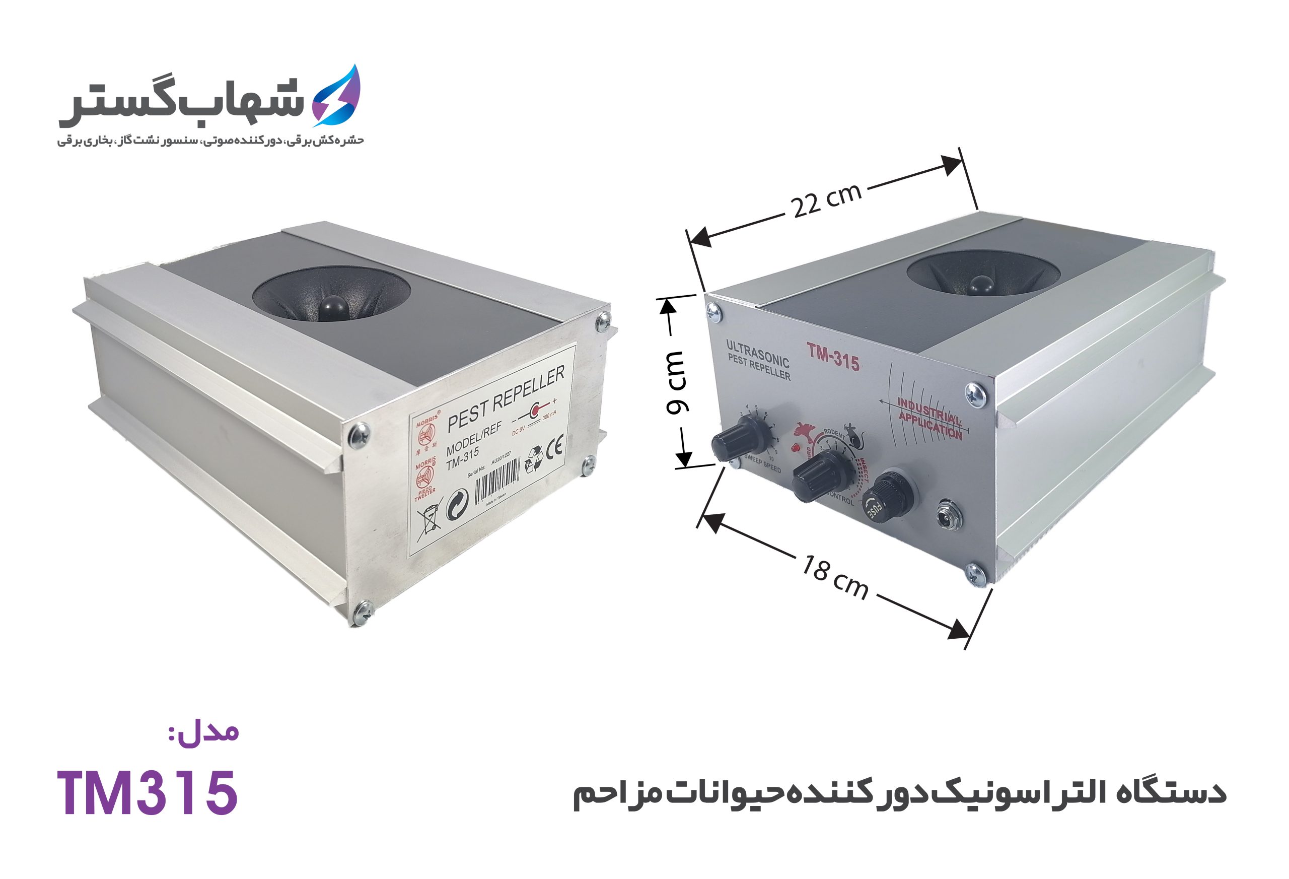 دستگاه التراسونیک شهاب گستر مدل TM-315 یک محصول پیشرفته در زمینه کنترل و دفع حیوانات و حشرات مزاحم است که با استفاده از تکنولوژی Ultrasonic Sound Waves طراحی شده است. این دستگاه با تولید امواج صوتی در بازه فرکانسی 20 kHz الی 65 kHz که خارج از محدوده شنوایی انسان است، موجب ایجاد ناهنجاری و اختلال در سیستم عصبی و شنوایی جوندگان و حشرات شده و آنها را از محیط دور میسازد.